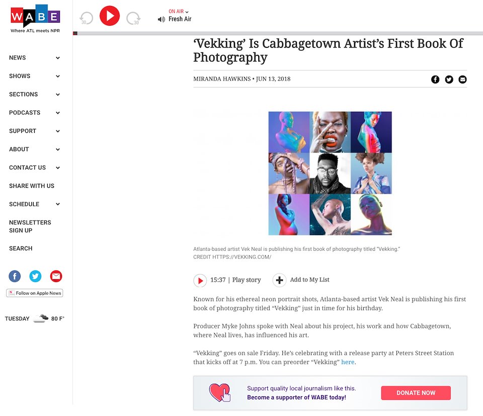 Known for his ethereal neon portrait shots, Atlanta-based artist Vek Neal is publishing his first book of photography titled “Vekking” just in time for his birthday. Producer Myke Johns spoke with Neal about his project, his work and how Cabbagetown, where Neal lives, has influenced his art.